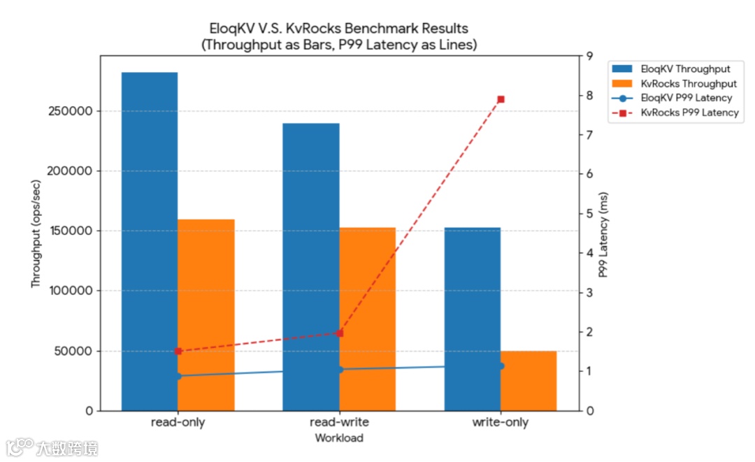 下面的实验对比了两款Redis兼容的Key-Value存储,分别是基于RocksDB的KvRocks和基于 EloqStore(iouring+协程)的EloqKV。 从实验结果可以看出,iouring+协程技术,无论是吞吐还是长尾延时,都显著优于传统RocksDB存储。