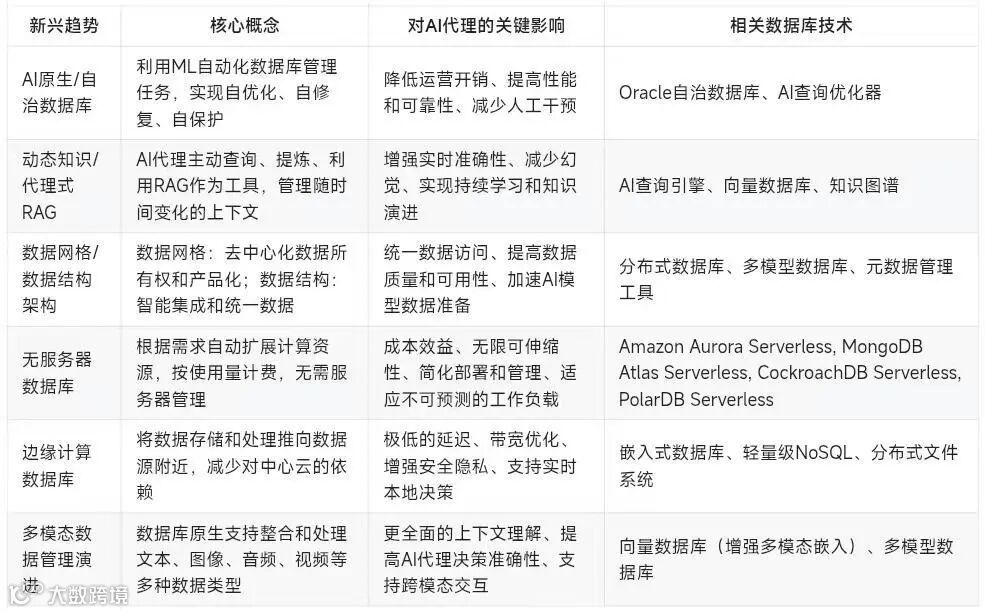 本报告对当前人工智能(AI)代理(Agent/智能体)开发所需的数据库产品进行了全面分析,并展望了这些技术的未来发展趋势。AI代理以其自主性、多模态处理能力和持续学习特性而闻名,这要求其数据基础设施必须高度复杂且多样化。没有单一的数据库范式能够充分满足所有这些需求,因此 “多模态”方法变得至关重要。向量数据库已成为语义理解和检索增强生成(RAG)的基石,而图数据库则对实现复杂推理和上下文感知至关重要。传统的关系型数据库和NoSQL数据库在结构化数据和灵活数据管理方面继续发挥关键作用。展望未来,数据库领域将受到AI原生和自治系统、动态知识架构、去中心化数据网格/数据结构模型以及分布式无服务器/边缘计算解决方案的深刻影响。这些趋势将共同推动更智能、高效、可靠的AI代理部署,从根本上改变企业利用数据进行AI驱动创新的方式。