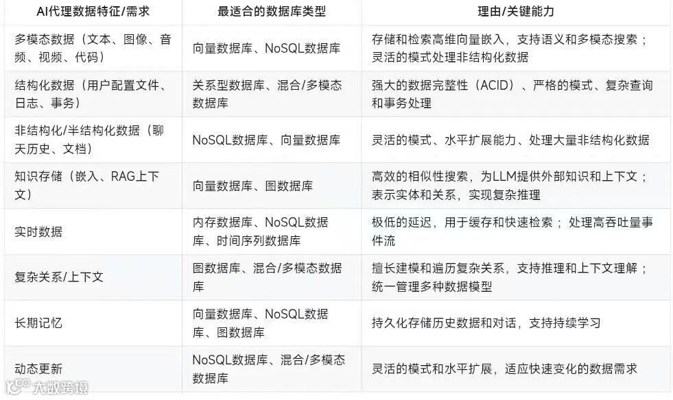 AI代理的定义表明其能够同时处理文本、语音、视频、音频和代码等多模态信息,并具备对话、推理、学习和决策的能力 。它们能够执行复杂的、多步骤的操作,并随着时间的推移进行学习和适应 。这种能力要求管理多种多样的数据类型:例如,用户配置文件和日志等结构化数据;文本、图像和向量等非结构化数据;用于知识存储的嵌入(embedding向量)和RAG上下文;以及聊天历史等实时数据 。