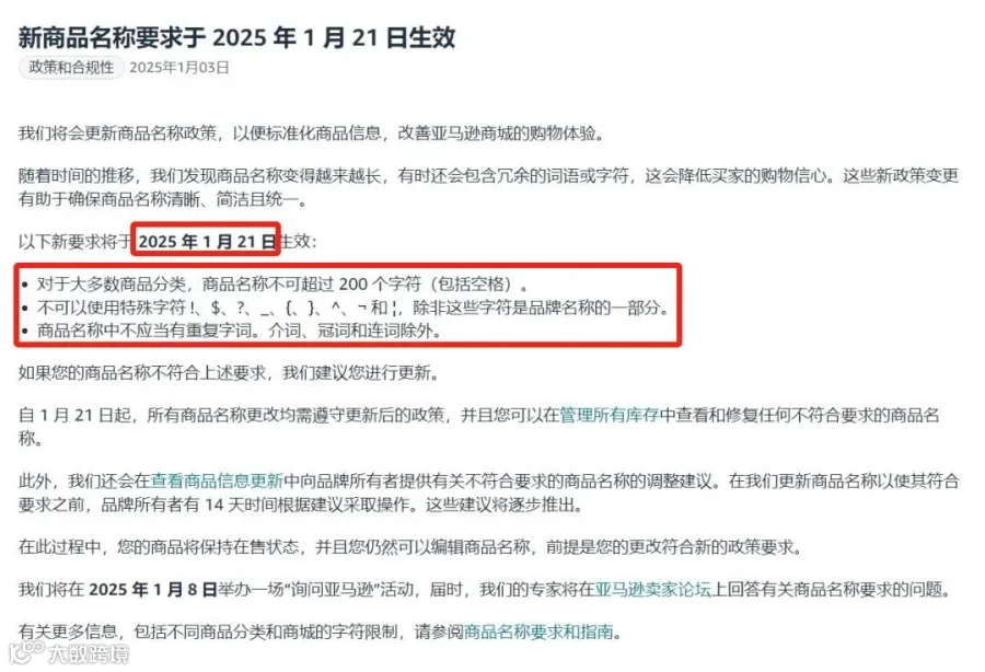 亚马逊宣布,自1月21日起实施新的商品标题规范,主要涉及字符长度、特殊字符使用及关键词重复等方面的要求[k]。