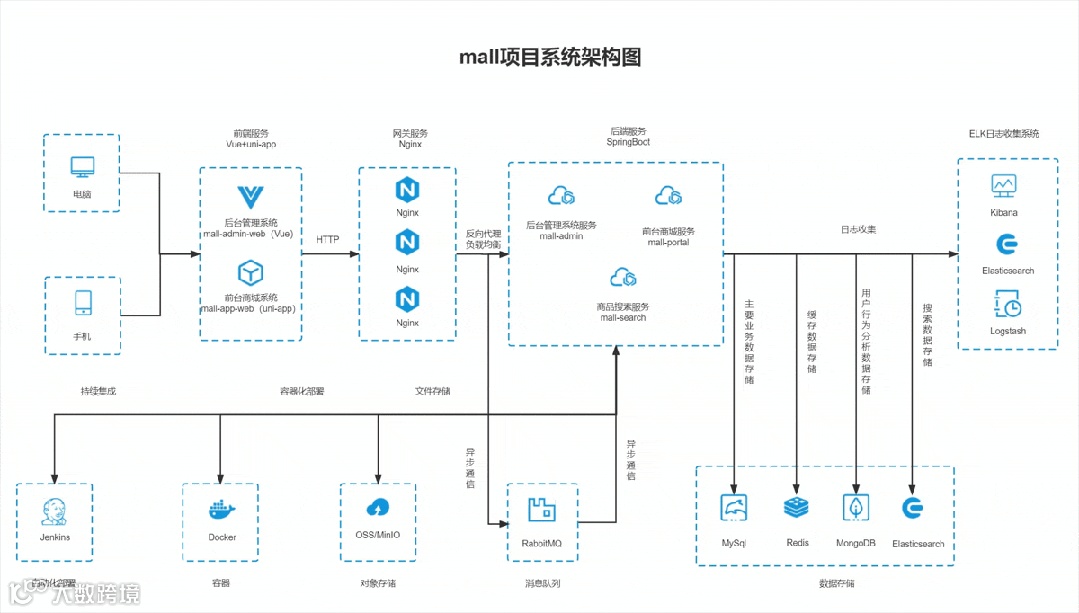 Github上标星60K的电商实战项目mall,全套 视频教程 已更新完毕!全套教程约40小时,共113期,通过这套教程你可以拥有一个涵盖主流Java技术栈的完整项目经验,同时提高自己独立开发一个项目的能力,下面是项目的整体架构图,感兴趣的小伙伴可以点击链接 mall视频教程 加入学习。