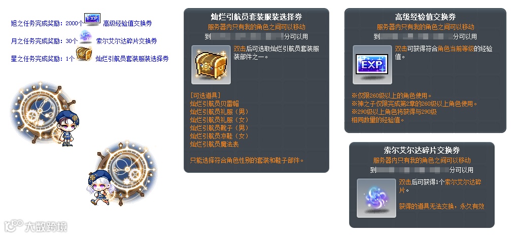 3. 光之通行证:使用30000抵用券,可以在之前错过的太阳、月亮任务中选择1个进行弥补。