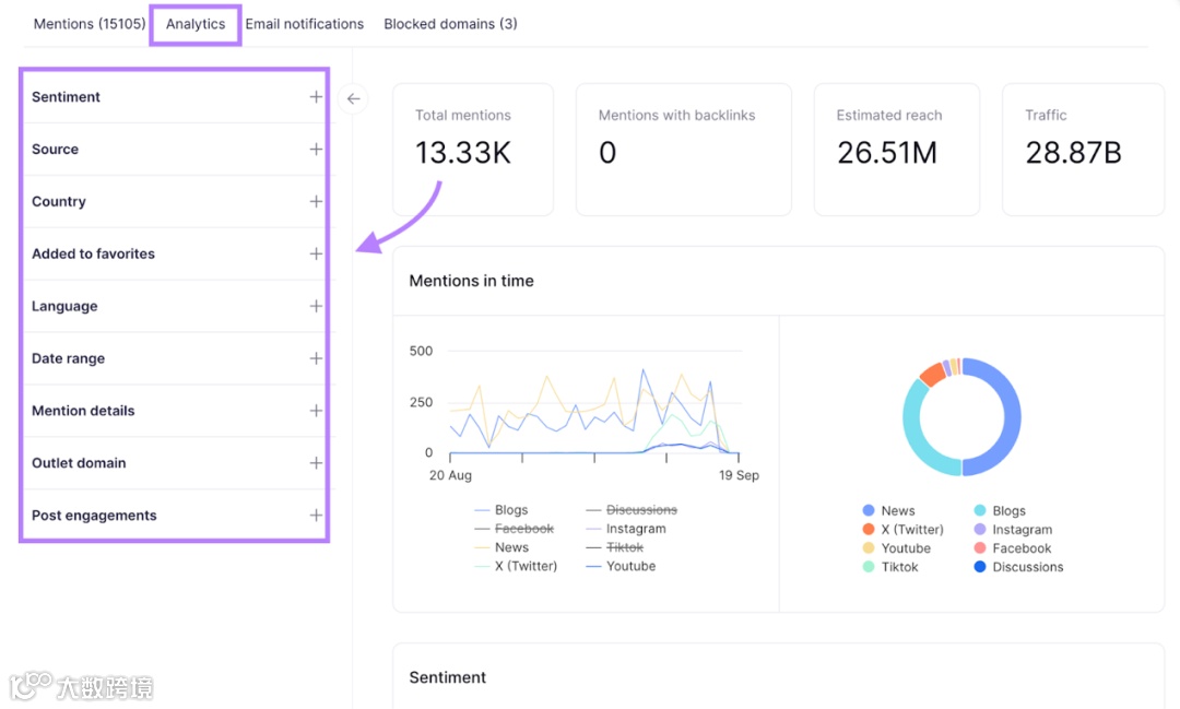 进入“Analytics”页面,可查看提及总数、含反向链接数、预估覆盖人数、情感分布、声量趋势等核心指标。