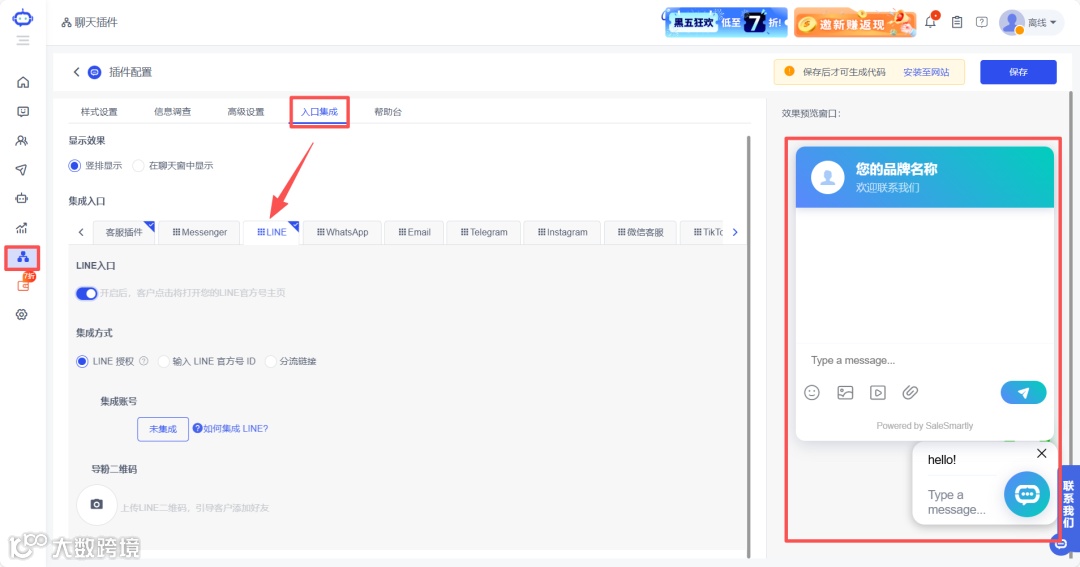 SaleSmartly 支持“LINE 授权”、“输入 LINE 官方号ID”、“分流链接”三种集成方式;还可以选择 LINE 入口在竖排显示还是在聊天窗中显示。