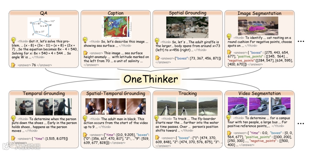 通过联合训练,OneThinker在空间与时间维度建立统一推理能力,实现跨模态、多任务的通用视觉理解。