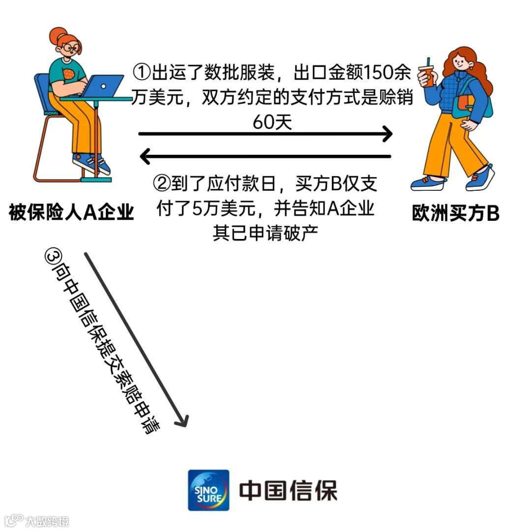 广东省某服装进出口企业A在2024年底至2025年初向欧洲买方B出运多批货物,累计出口金额超150万美元,支付方式为赊销60天。到期后,买方仅支付5万美元,并通知已申请破产。A企业随即向中国信保报损并委托追讨。