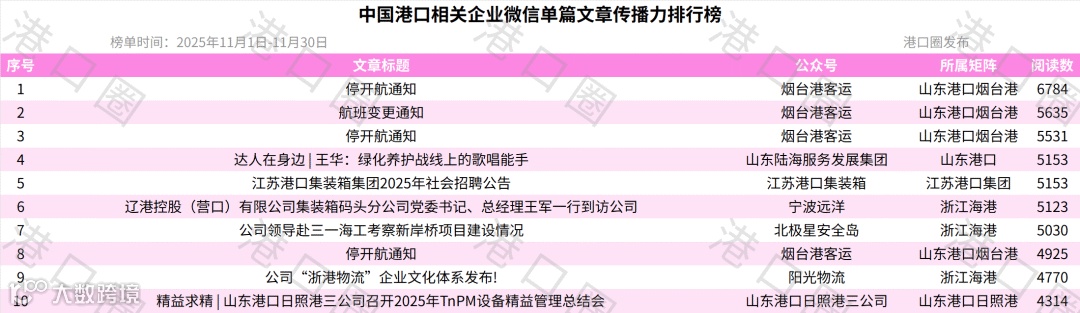 11月是全年收官冲刺与谋划来年的关键节点,中国港口宣传战线同样呈现高度活跃态势。本期中国港口企业微信传播力排行榜前三易主,中部梯队竞争加剧,并出现多匹“黑马”。
