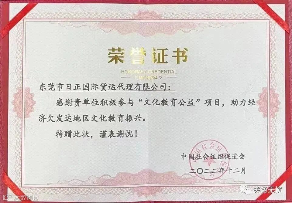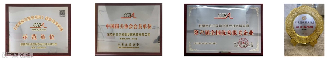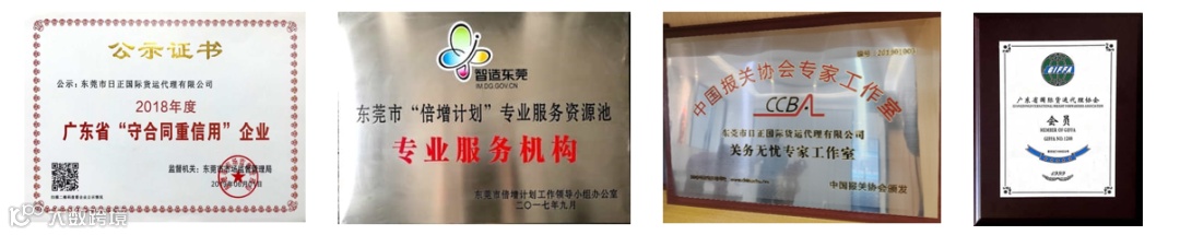 中国百优报关企业、海关高级认证报关企业、中国首批预归类企业、中国报关协会会员单位、广东黄埔报关协会副会长单位、广东省小微企业服务机构联合会会员单位、东莞市倍增计划专业服务资源池专业服务机构、广东省国际货运代理协会会员单位、2012,2015,2018,2021连续四届荣获全国优秀报关企业、2018年度广东省守合同重信用企业、ISO9001:2015标准认证、《代理报关服务规范》国家标准实施示范单位。
