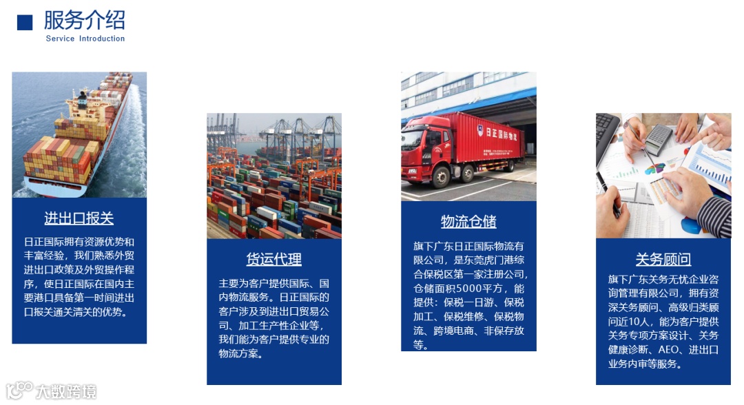 日正国际供应链科技股份有限公司成立于2007年,服务范围涉及到全国各主要口岸及世界的服务网点,是一家为客户提供货代业务、通关业务、报检、外贸、商务、运输、仓储、包装和配送等一条龙优质服务的跨国供应链再造商。