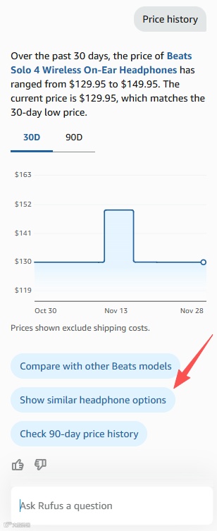 Rufus不仅展示价格走势,还引导消费决策,例如推荐“对比同类产品”或“寻找高性价比替代品”,进一步提升价格在购买决策中的权重。