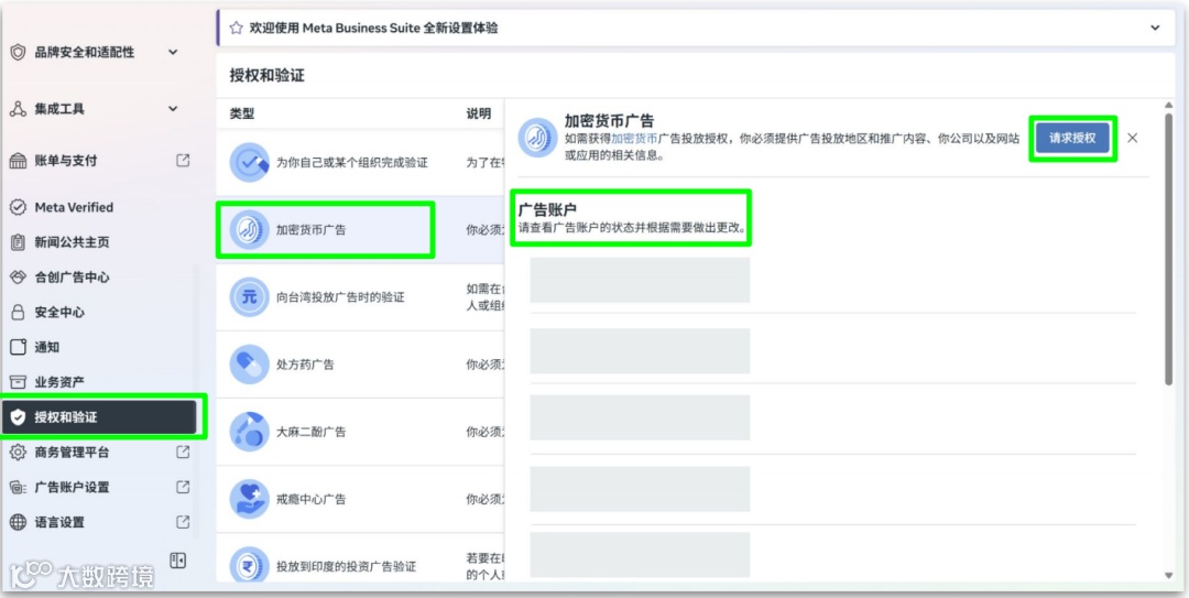 - 申请流程简化:广告主现通过Meta Business Suite中的“授权和验证”选项提交申请,取代原联系表单;支持在同一申请中为同一业务资产组合下的多个广告账户一次性完成授权。