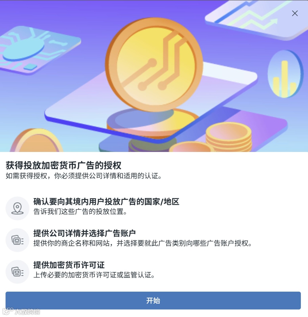 - 自2025年12月3日起,可通过Meta Business Suite中“授权和验证”选项卡提交申请,需提供公司详情、确认投放国家/地区、选择待授权广告账户,并上传加密货币许可证或监管认证;