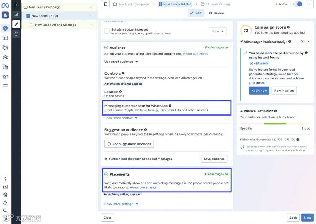 - 进阶赋能型版位广告系列将自动增设至WhatsApp版位;手动版位广告系列需手动修改或复制以添加;