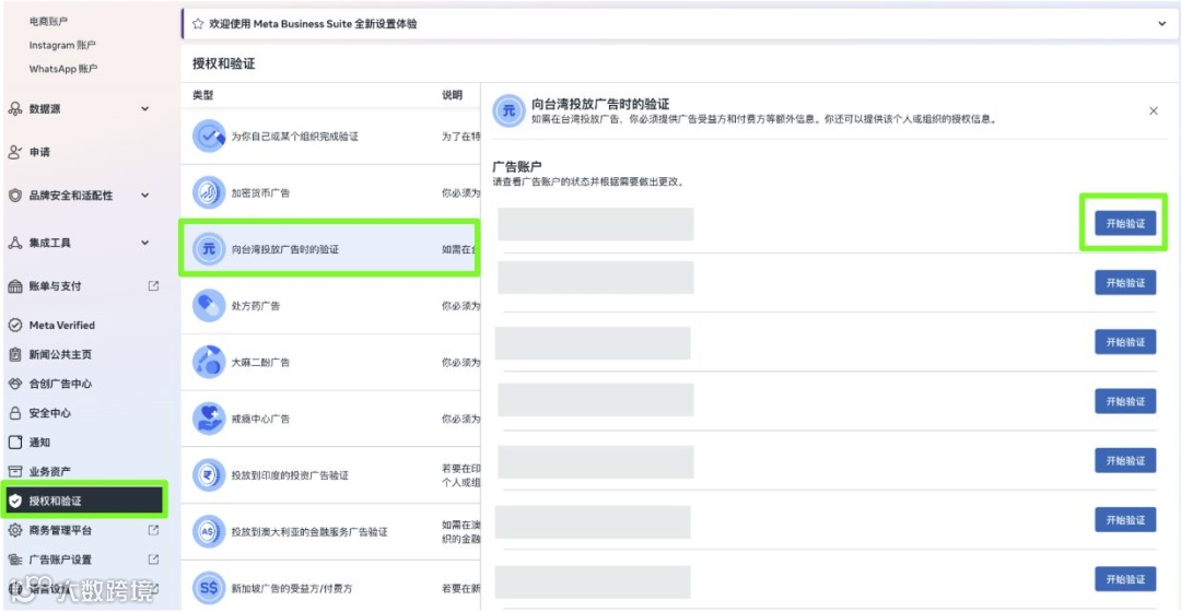 - 若需更改受益方或启动验证,请前往Meta Business Suite的“授权和验证”选项卡操作。