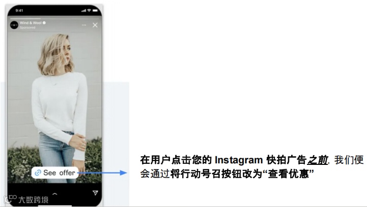 功能概述:用户点击Instagram快拍广告前,行动号召按钮将自动改为“查看优惠”,提前展示优惠信息;点击后仍将在应用内浏览器中继续突出展示。