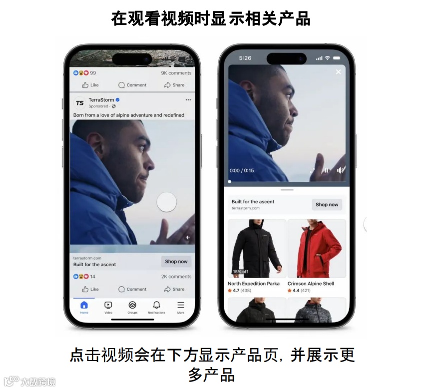 功能概述:正在将Facebook动态版块中视频广告的点击后体验推广至更多广告主。用户轻触视频广告后,可看到分屏界面,在继续观看广告的同时浏览系统精选的目录商品。