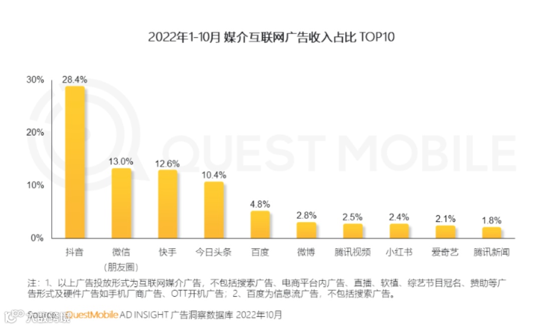 这很难说没有受到抖音的分流影响。由于主打算法推荐的短视频,抖音的广告转化率更高,因而对广告主的吸引力更强。QuestMobile披露的《2022全景生态年度报告》显示,2022年1月-10月,媒介互联网广告收入排行榜中,抖音占比28.4%,位居第一。