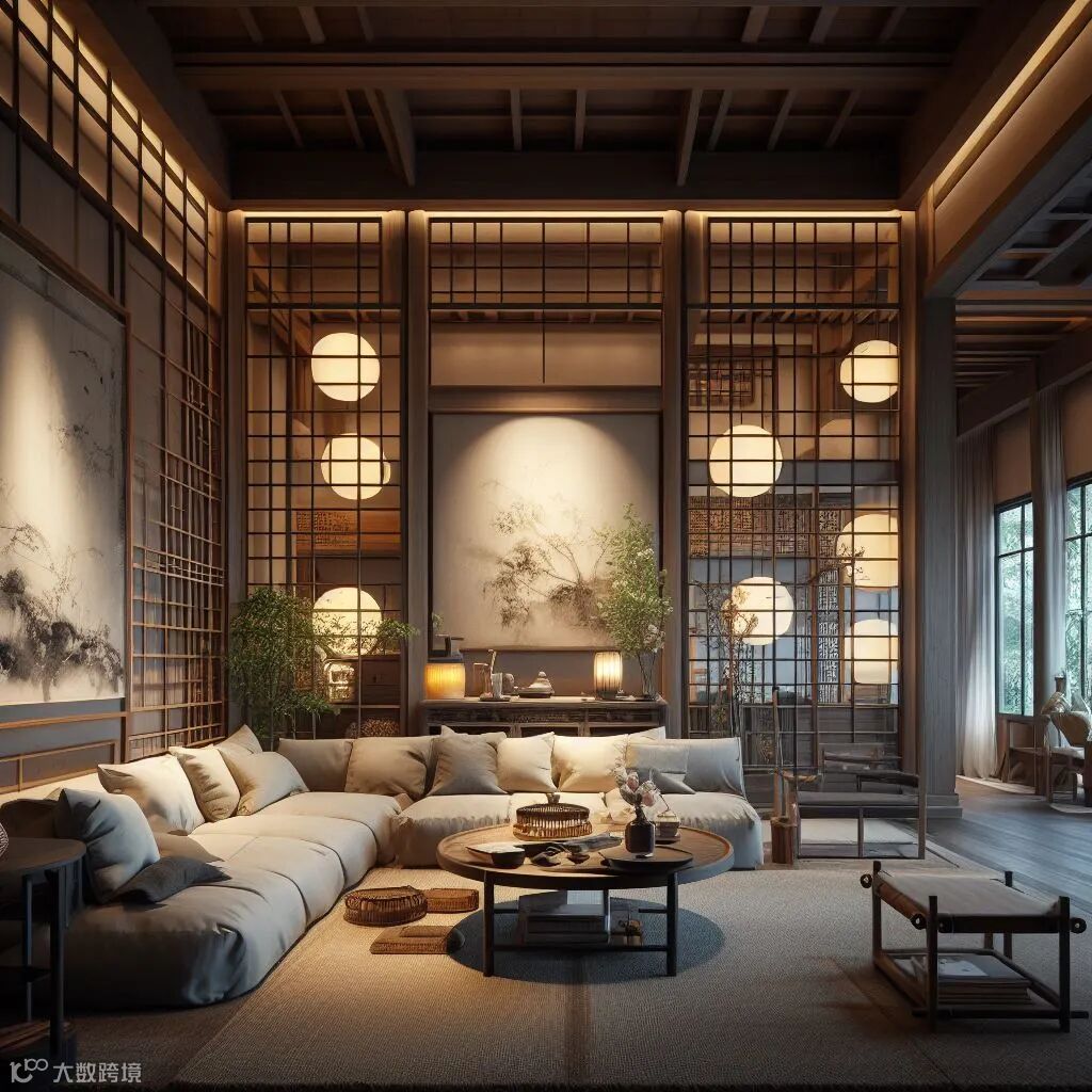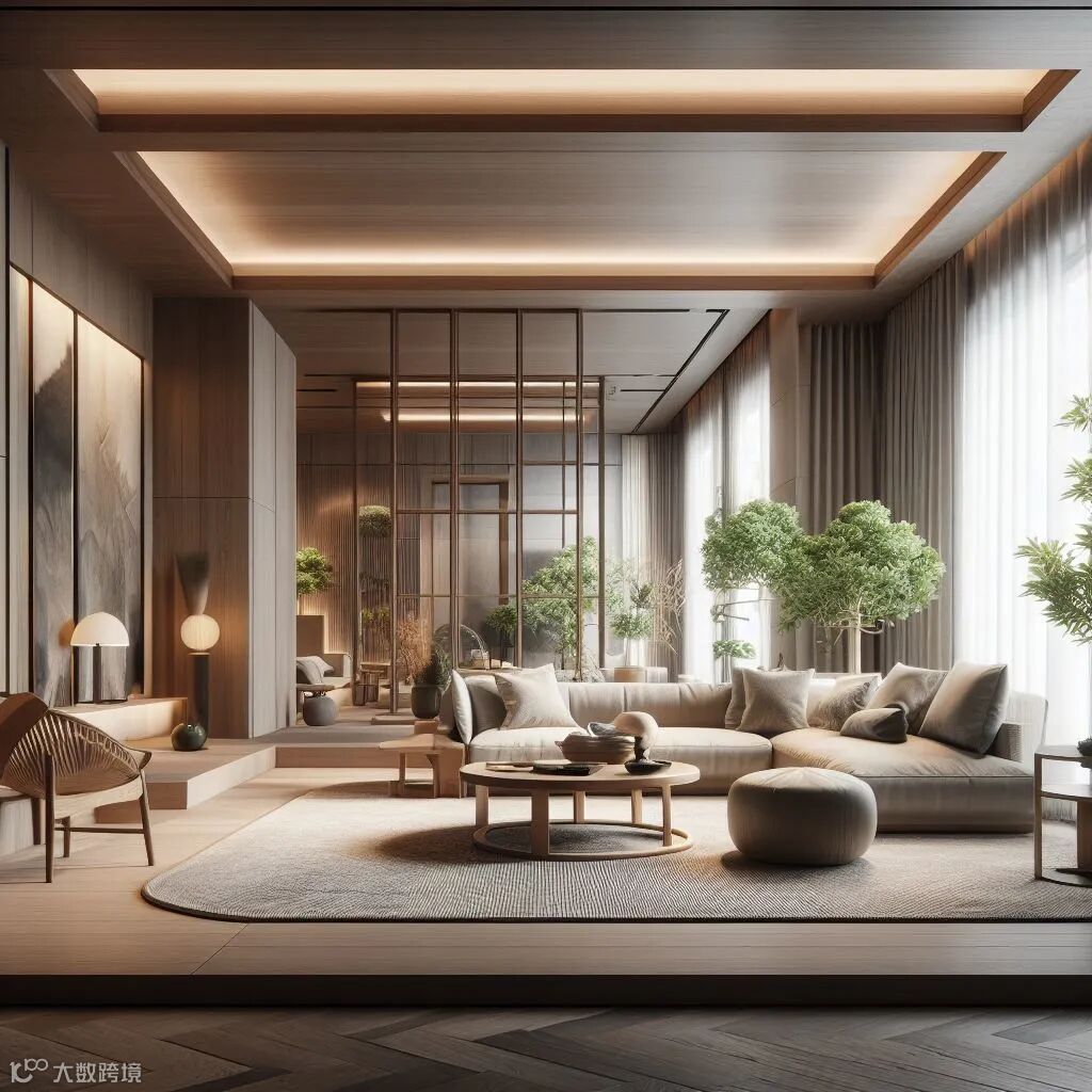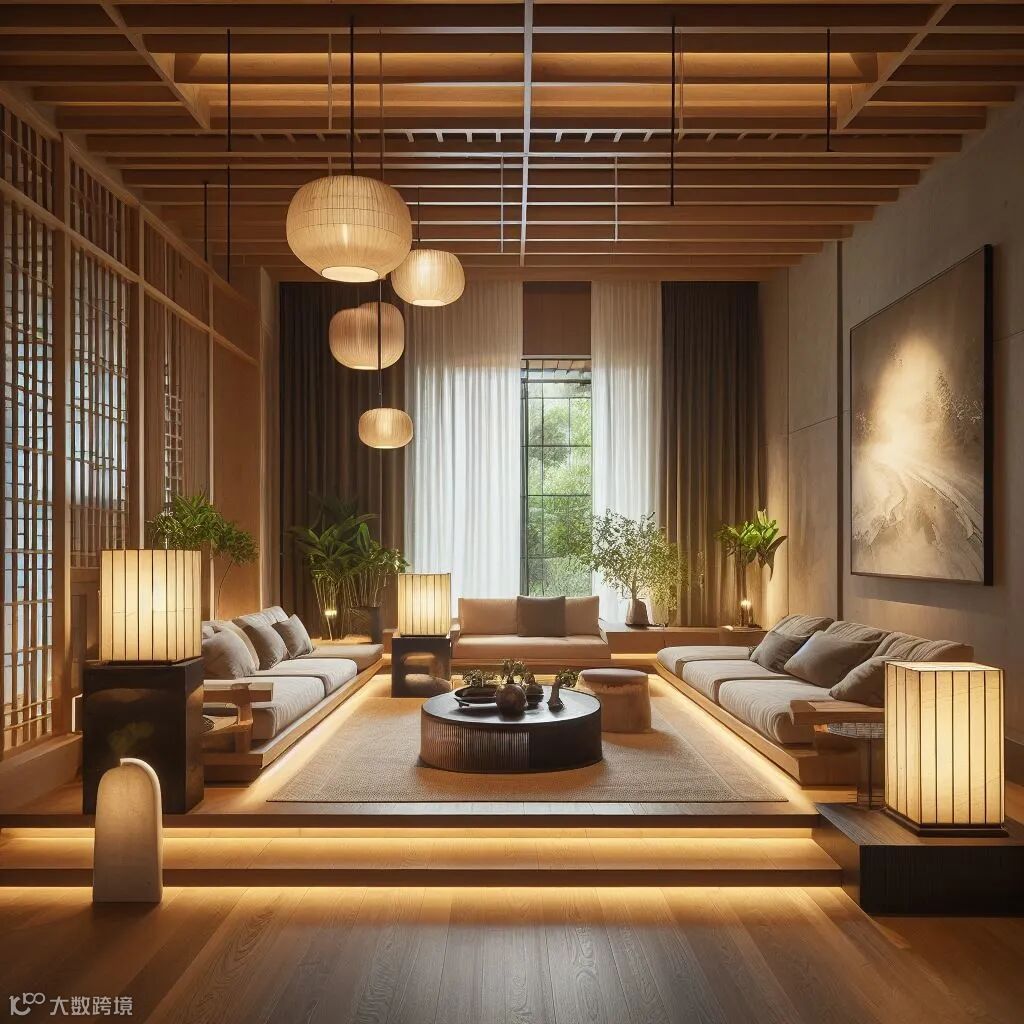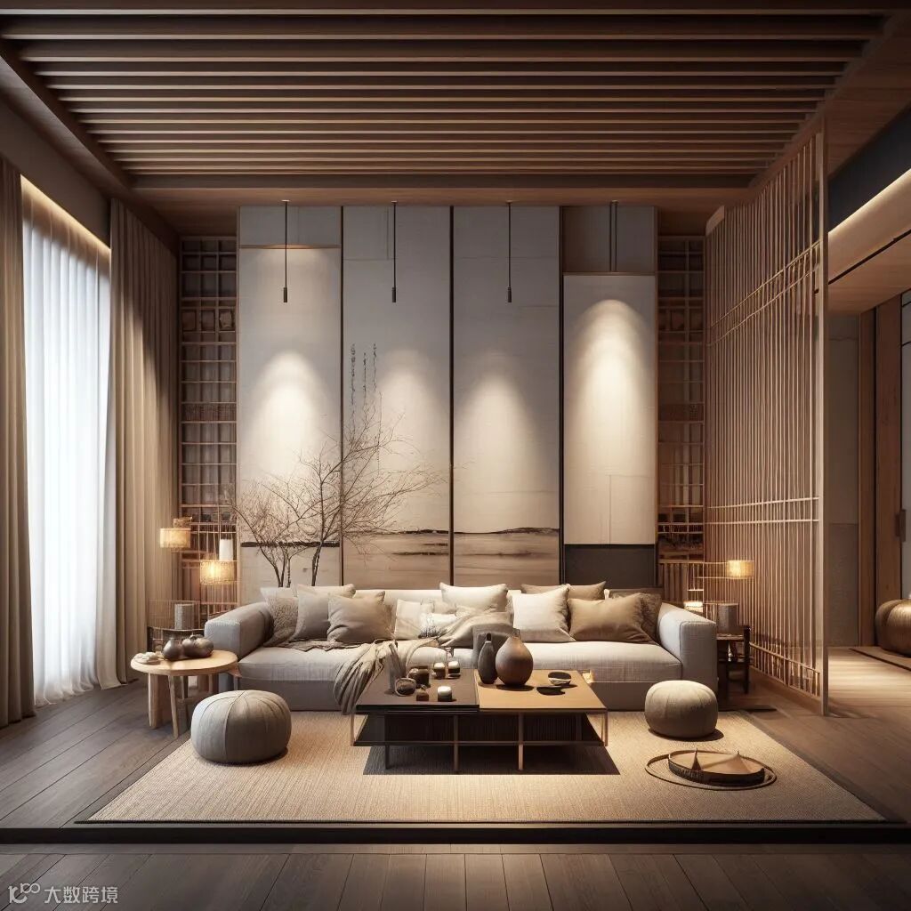 一、展现了不完美和时间性的美学。艺术作品应描绘住宅环境中的室内空间,特别注意客厅区域。灯光应该自然柔和,增强整体的禅意氛围。风格要体现侘侘设计风格,