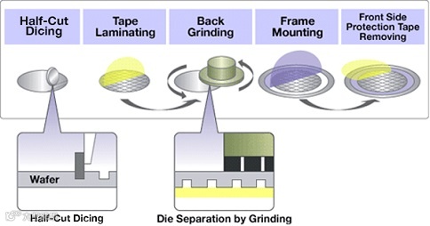 把晶圆切到一半,但不切穿,让每颗 die 形状先定下来;背面仍然保持连接,晶圆整体性依旧存在。然后将晶圆背面开始磨薄,逐渐把未切透的硅磨掉,最后薄薄的一层硅被磨穿。详见之前的文章: