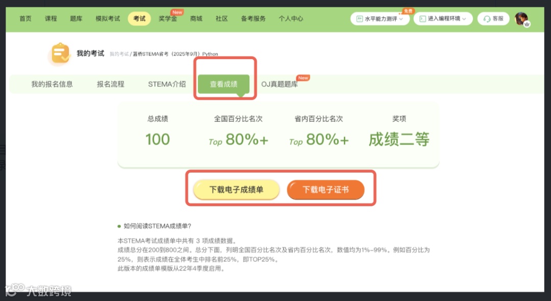 登录STEMA学习平台学生端http://uu.stema.top,点击【考试】—【STEMA】—【查看成绩】