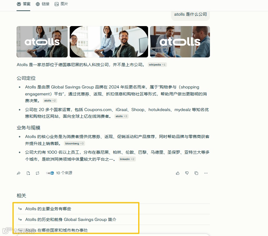 示例:输入“atolls 是一家什么公司”,可获得详细企业介绍及关联问题提示,便于深入挖掘信息。