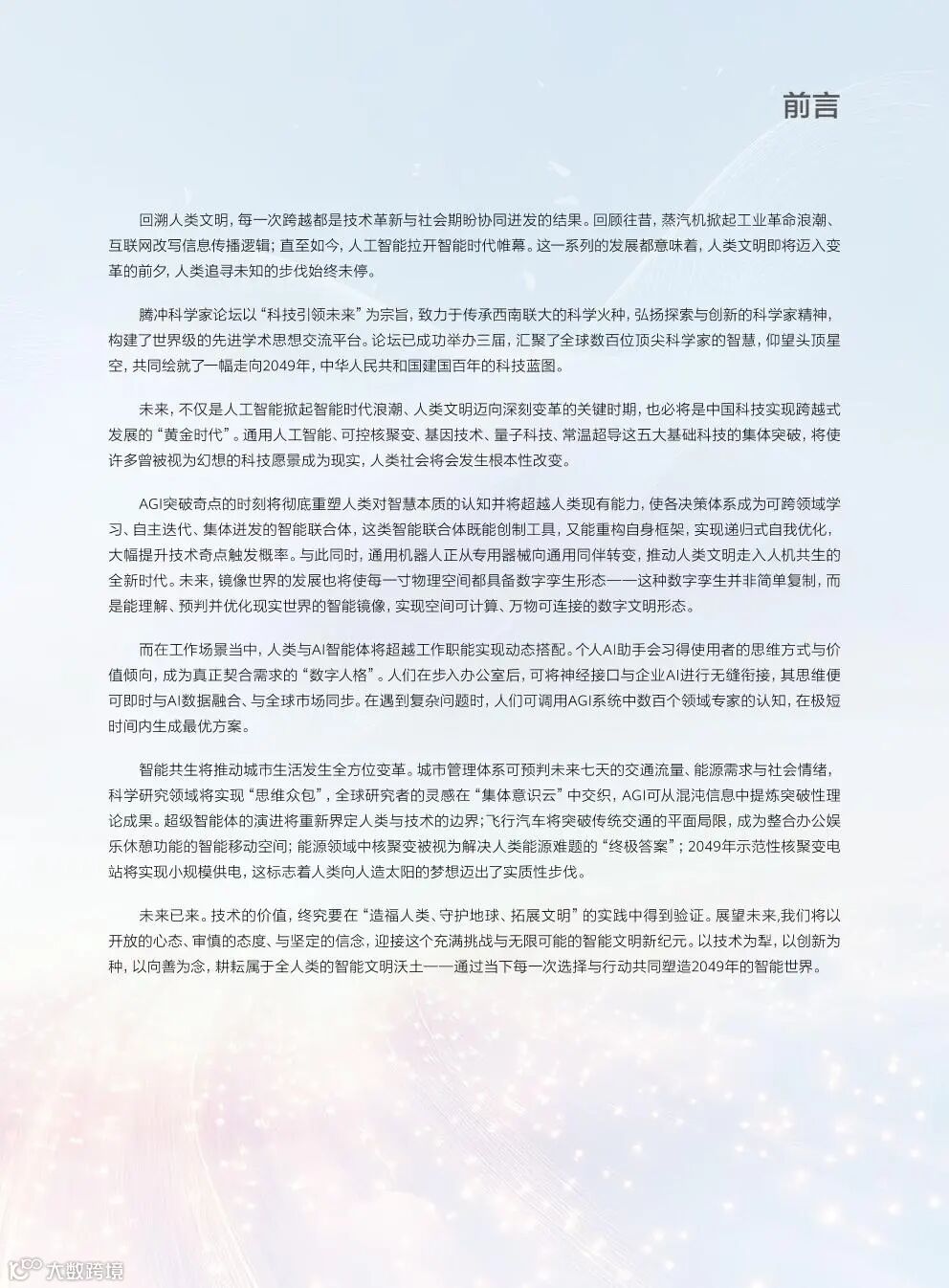 2049年的未来并非注定,而是由当下每一次选择共同塑造。报告呼吁社会各界以开放、审慎、合作的态度,共同推进技术造福人类、守护地球生态、拓展文明边界,迈向人机共生、虚实交融、绿色普惠的智能新纪元。
