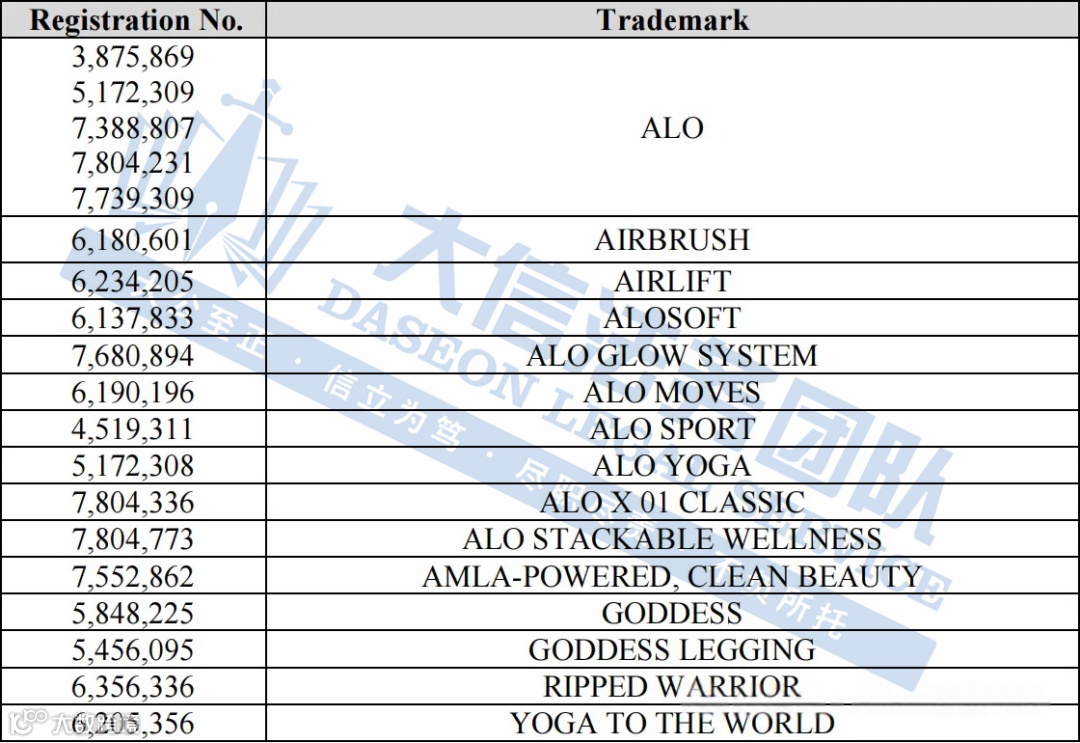 本案属商标权维权,涉及“ALO”、“AIRBRUSH”、“AIRLIFT”等共计15项注册商标,覆盖第3、5、9、18、25、35、41、43类国际分类。上述商标主要用于服装、配饰、护肤产品及线上零售服务等领域,权利明确,侵权判定标准清晰,建议卖家及时自查商品信息,避免使用相似标识。
