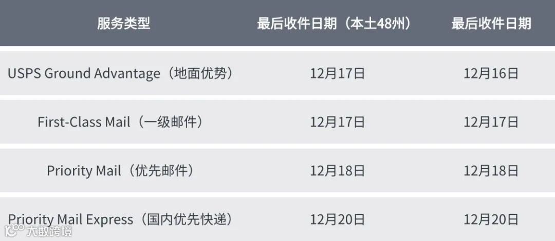 对于期望包裹在12月25日圣诞节前送达的用户,USPS给出了清晰明确的最后邮寄日期建议: