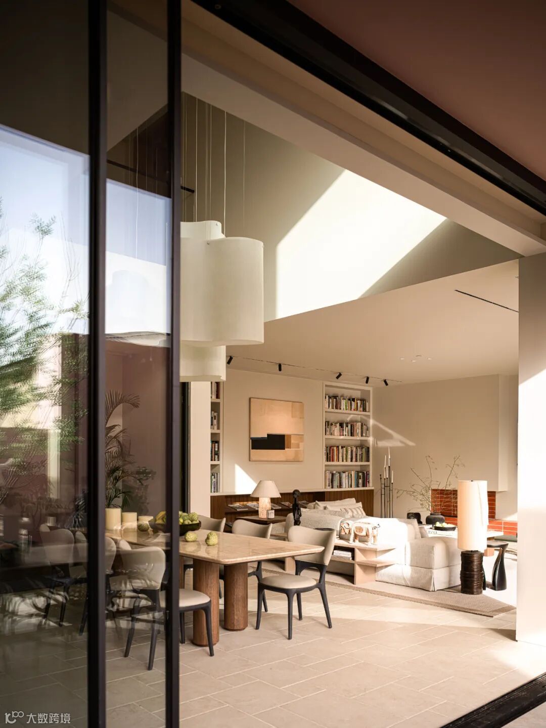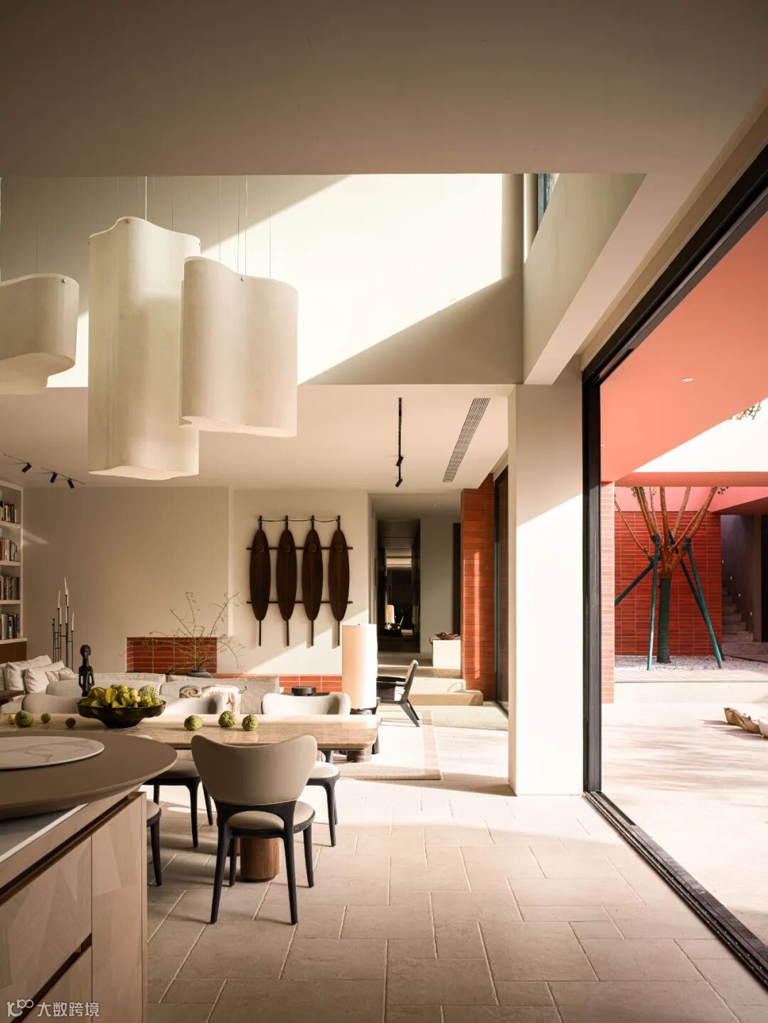 客餐厅与分布在各个区域的内庭院形成开放式联动格局,庭院的自然景致穿透玻璃界面,让室内外空间相互渗透。餐厅以跨层的挑高形成通透的视觉感,自然垂落的吊灯为空间赋予一丝艺术和温暖的氛围。