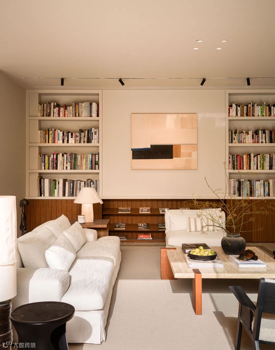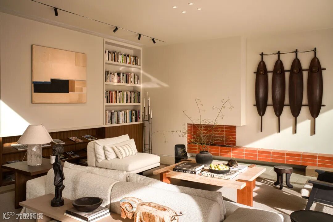 米色的沙发围合出日常休憩的场景,闲暇时在此静享阅读时光,或是与家人分享彼此的日常,都十分惬意。木质收纳柜兼具实用与美观,里面陈列着主人的藏品与书籍,每一件物品背后都有着独特的故事。墙上的艺术挂画为空间增添了艺术氛围,让客厅不止是生活的场所,更成了艺术的小小展厅。壁炉在秋冬季节散发着温暖的火光,为客厅镀上一层温馨的滤镜,让这里成为家人团聚、朋友小聚的暖心角落。