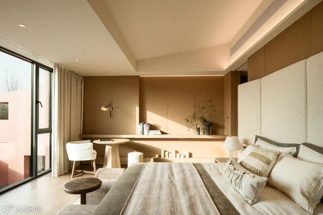空间布局兼顾功能与美感:一侧设置了木质书桌与简约座椅,构成一个舒适的工作区。另一侧的休闲区则倚靠大幅玻璃窗,将室外景致引入室内,让人在休憩时能远眺自然、放松身心。墙面上的艺术灯具造型别致,赋予空间独特的艺术气息,使主卧不仅是安眠之所,更成为滋养精神的美学场域。