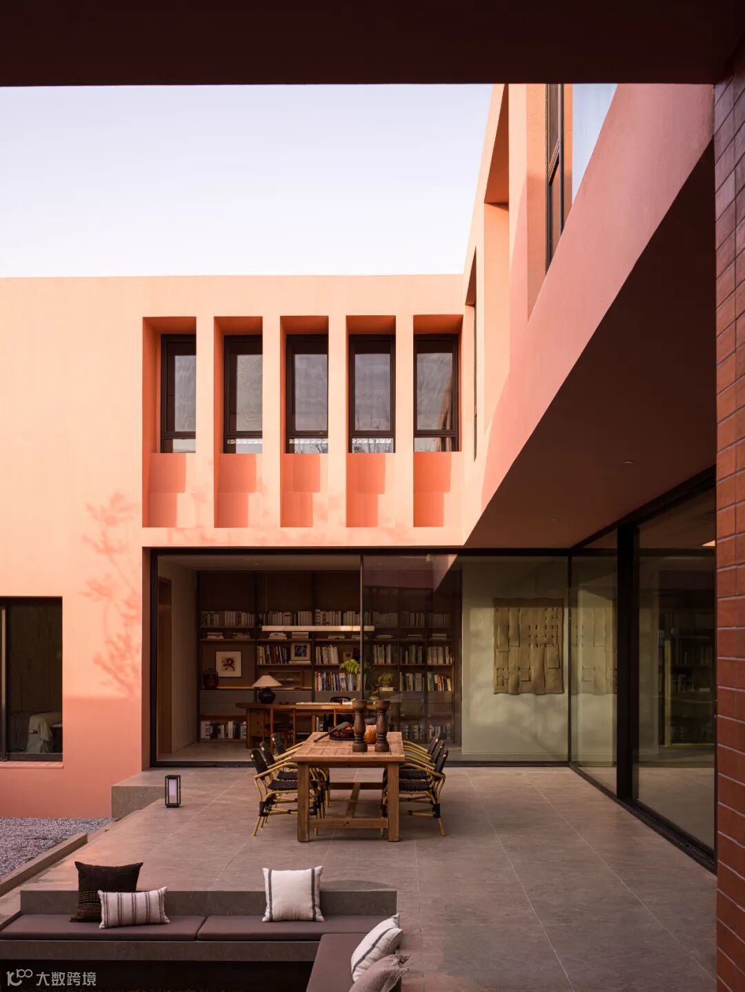 The selection of materials for the building facade takes into account both climate adaptation and emotional expression. The first floor uses solid facing bricks to resist the wind, sand, rain and snow in the north, with local red bricks taken from the earth's base color interspersed in some areas, which not only evokes regional memories but also reduces the sense of heaviness of the volume. The second floor uses low-saturation pink paint, which is not overly sweet and creates a retro and soft atmosphere, echoing the owner's yearning for a warm home. Its light color reflects strong light in summer, contrasting with the hard texture of the lower floor, making the building appear more light and airy.