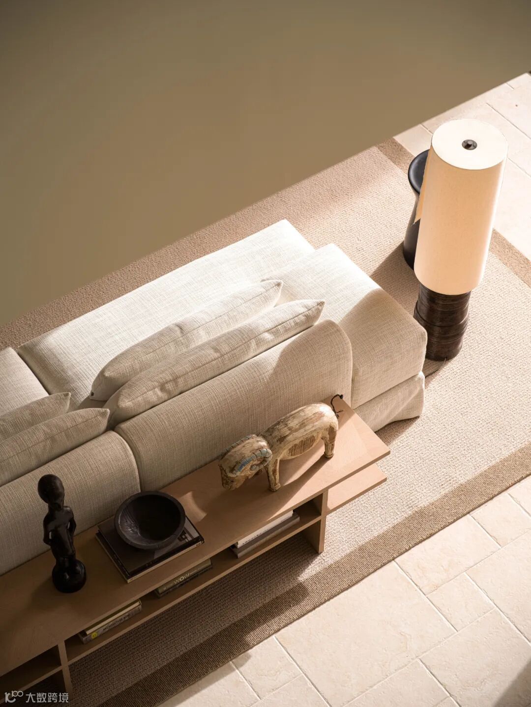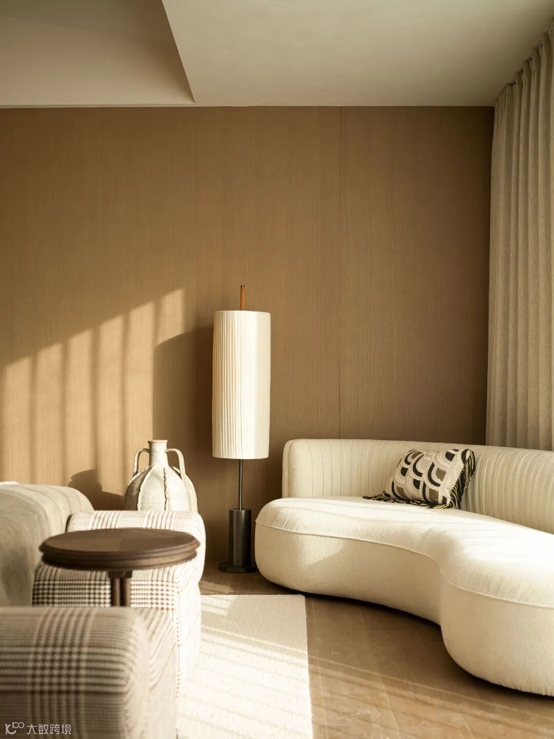 核心生活区客餐厅以开放式的布局消弭了空间的界限,使得风可以自由穿梭,也让家人间的互动毫无阻碍。室内的色调与建筑的外立面区分开,以中性色系的米白、浅灰、原木棕表达舒适柔和的氛围。