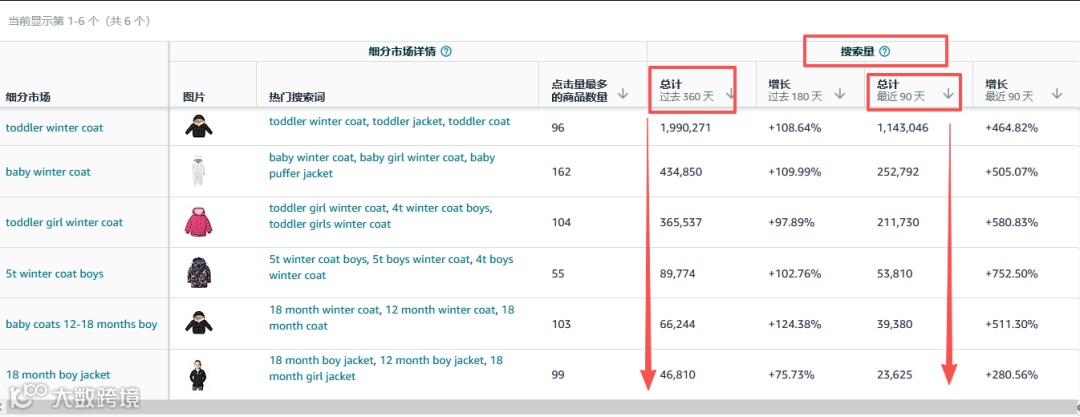 同样的操作,将过去360天或过去90天搜索量增长情况从大到小排序,得出市场增长情况,通过比对不同细分市场的平均售出商品数量,了解对应的销量情况。