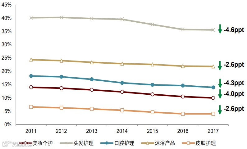 核心市场与品类份额下滑。2011–2017年,全球美妆个护市场份额下降1.0个百分点,中国区下滑4.0个百分点;头发护理、口腔护理等主要品类均现下滑趋势[k]。