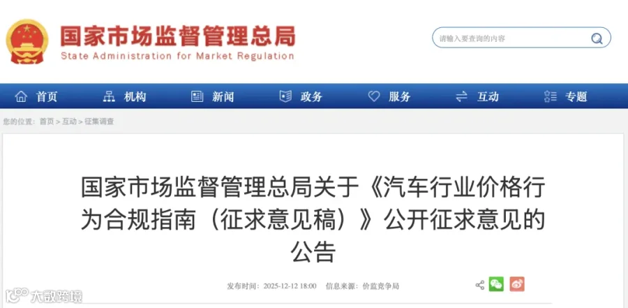 12月12日,国家市场监督管理总局就《汽车行业价格行为合规指南(征求意见稿)》(简称《指南》)公开征求意见。