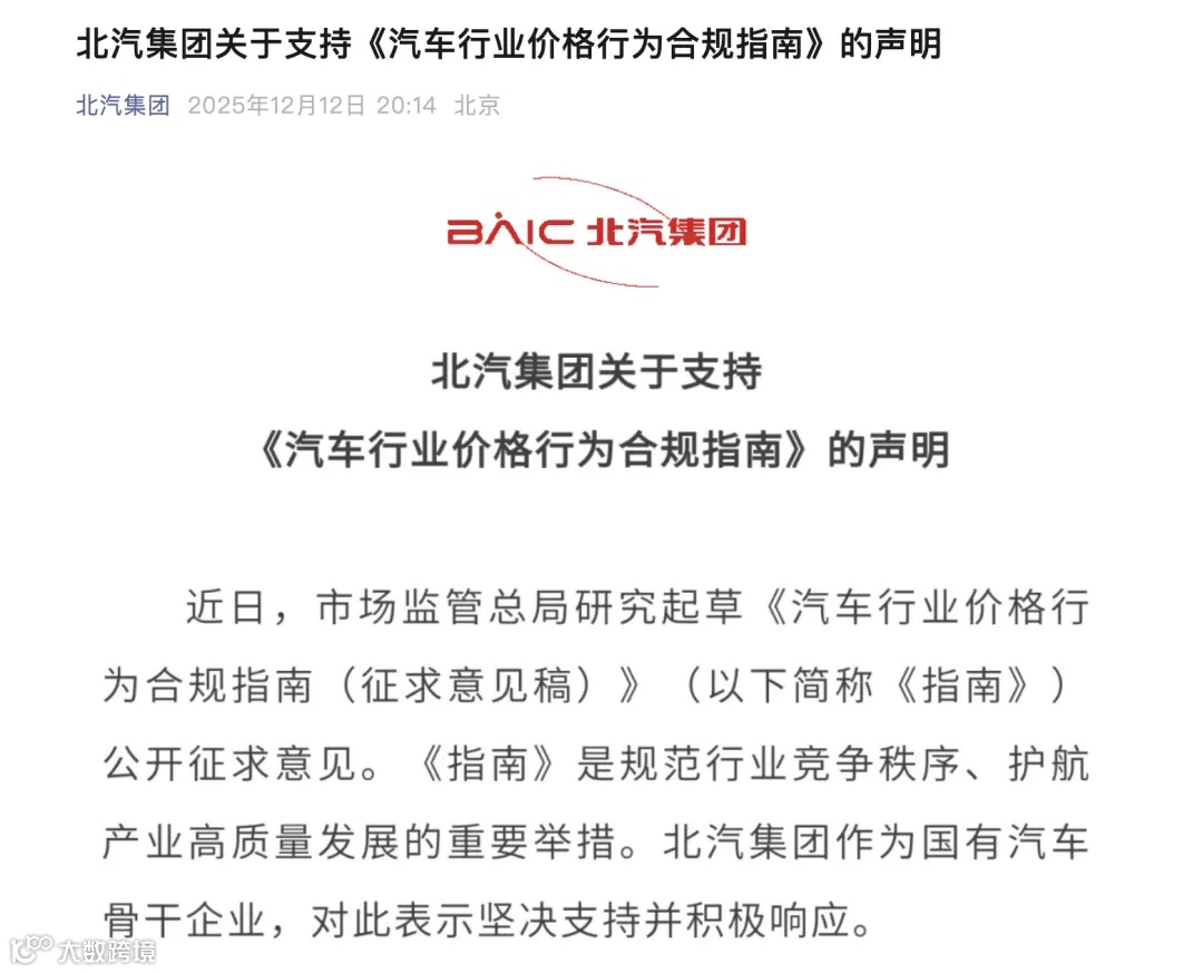 北汽集团发布关于支持《指南》的声明。声明称,北汽集团始终坚守依法合规经营底线,将完善价格合规管理体系,将指南要求嵌入产品定价、经销商管理、促销推广的全流程。严守公平竞争原则,坚决杜绝低于成本价倾销、虚假宣传等违规行为,规范明码标价,保障消费者知情权。