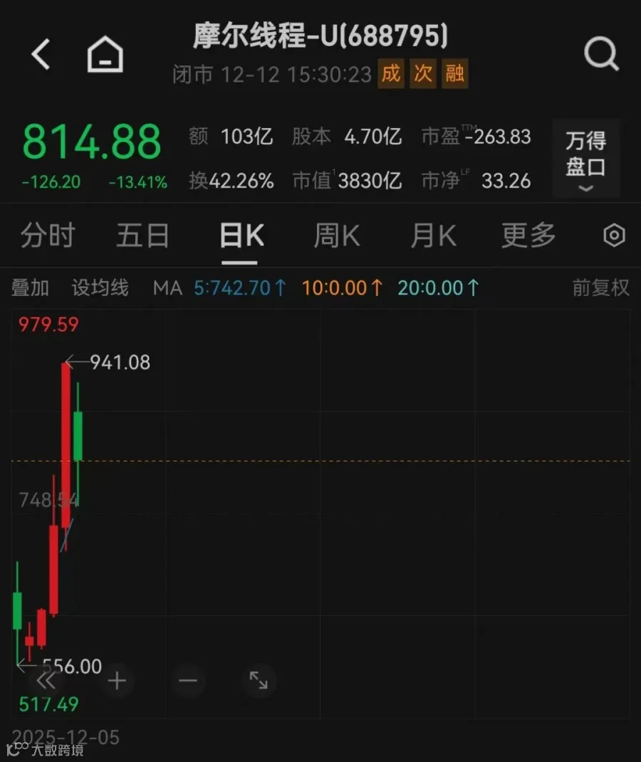 摩尔线程今日股价大幅走低,股价一度回落至800元下方。截至收盘,跌13.41%,报814.88元。此前,该股股价连续大涨。