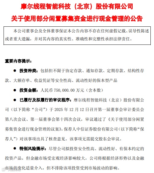 12月12日晚,摩尔线程公告,为提高募集资金使用效率,合理利用部分闲置募集资金,在不影响募集资金投资项目建设实施、募集资金使用计划和保证募集资金安全的情况下,合理使用部分闲置募集资金进行现金管理,提高募集资金使用效益。