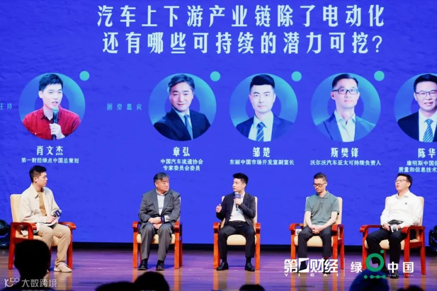 此次论坛还举办了三场行业圆桌讨论,分别聚焦不同产业的可持续发展路径。围绕汽车产业链的绿色转型,第一财经绿点中国总策划肖文杰与中国汽车流通协会专家委员会委员章弘,东丽中国市场开发室副室长邹楚,沃尔沃汽车亚太可持续负责人斯樊锋,康明斯中国供应链、质量和信息技术执行总监陈华探讨汽车上下游产业链中,除了电动化之外的可持续潜力。