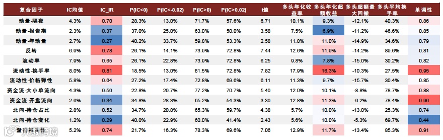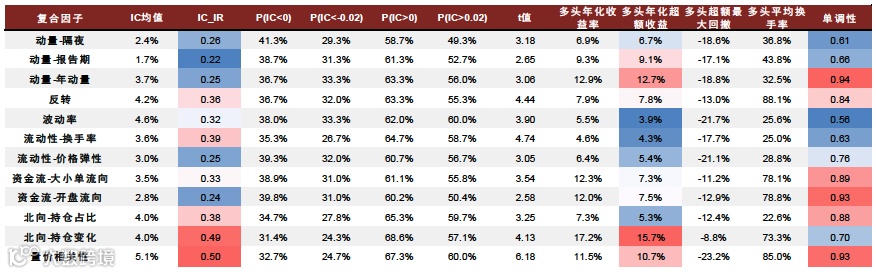 价量复合因子整体选股能力较强。多数因子分组单调性良好(多在0.85以上),但部分因子预测能力依赖空头端,多头超额收益偏低[k]。