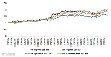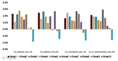 推荐使用vol_highlow_std、vol_upshadow_std、vol_w_downshadow_std等振幅标准差因子。不同周期因子选股能力相近,但6个月长周期因子的多头换手率显著低于1个月短周期因子,综合换手成本考量,长周期因子更具性价比[k]。