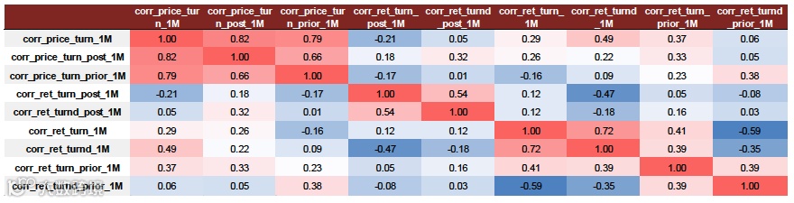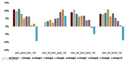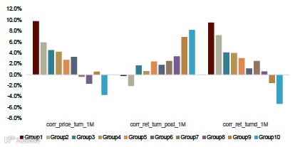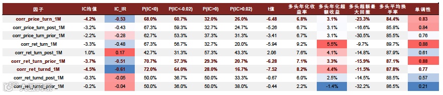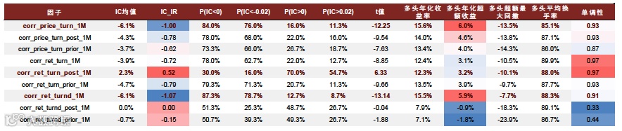 量能领先因子(corr_ret_turn_post_1M)反映信息扩散初期,与未来收益正相关,全市场IC_IR为0.52[k]。量价同步因子(corr_ret_turnd_1M、corr_price_turn_1M)反映信息扩散中后期,与未来收益负相关,全市场IC_IR达-1.00,选股能力突出[k]。