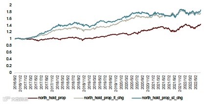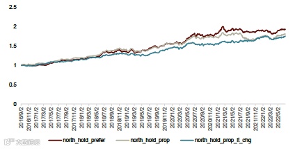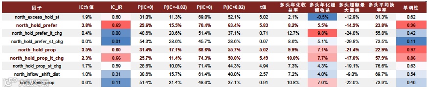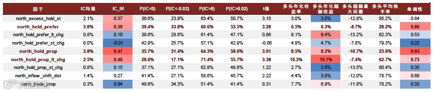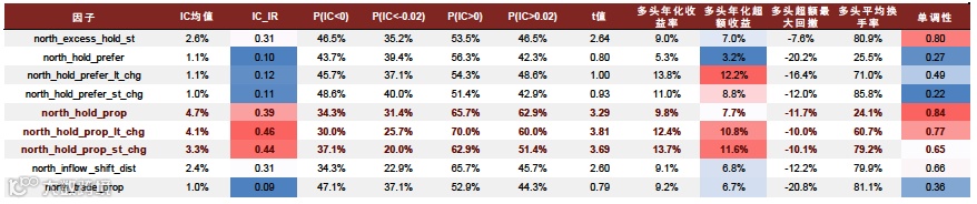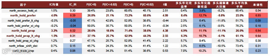 北向持仓占比因子(north_hold_prop、north_hold_prefer)整体有效性较好,IC_IR分别为0.60和0.69,但2021年以来选股能力有所回落[k]。北向持仓变化因子(north_hold_prefer_lt_chg)单调性一般,但在各指数范围内多头年化超额收益均超10%,表现强劲[k]。