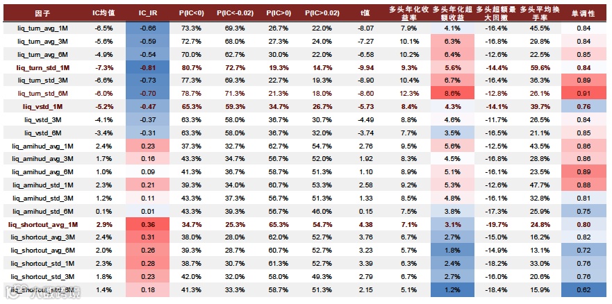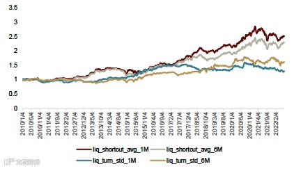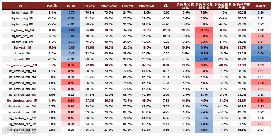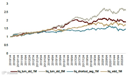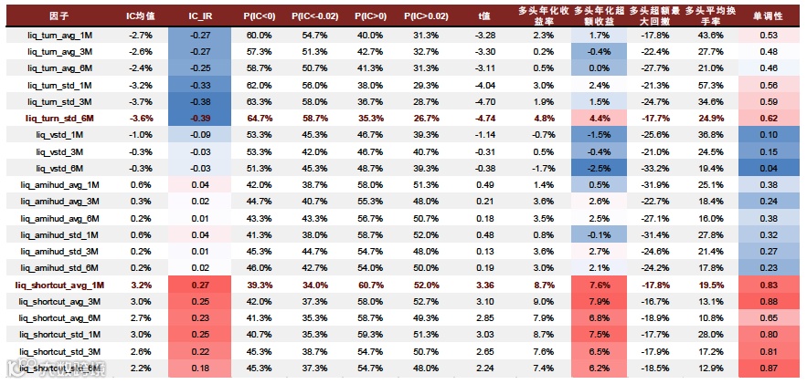 换手率标准差因子(liq_turn_std_6M)在沪深300、中证500、中证1000中的IC_IR分别为-0.39、-0.70、-0.81,表现良好[k]。价格弹性因子(如liq_vstd_1M)有效性略弱,但与换手率因子相关性低,可在构建复合流动性因子时作为有效补充[k]。