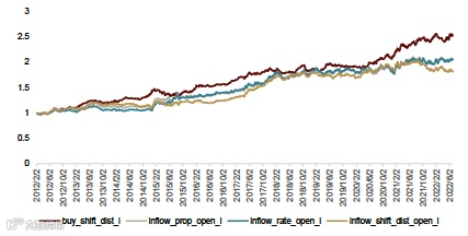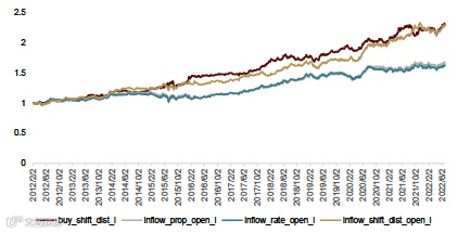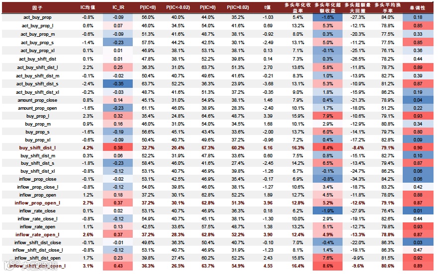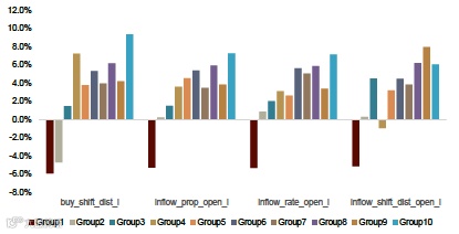 核心逻辑是追踪“聪明资金”流向。大单买入因子(buy_shift_dist_l)具正向预测能力,全市场IC_IR达0.78;小单主动买入因子(act_buy_shift_dist_s)则呈负向预测(IC_IR为-0.46),体现机构与散户行为差异[k]。开盘资金流入因子(inflow_shift_dist_open_l)在各指数中多头年化超额收益达6.1%-8.8%,单调性良好,值得关注[k]。
