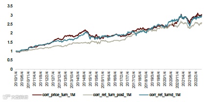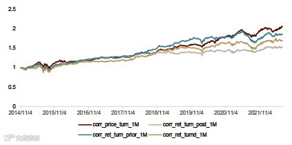 在沪深300范围内,corr_price_turn_1M与corr_ret_turnd_1M因子表现较优,其多头组合显著跑赢基准,空头显著跑输,单调性良好。其中corr_price_turn_1M多头收益尤为突出。corr_ret_turn_post_1M多头亦显著跑赢,但三者在2021年上半年均出现阶段性回撤,提示存在短期失效风险[k]。