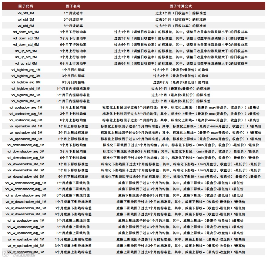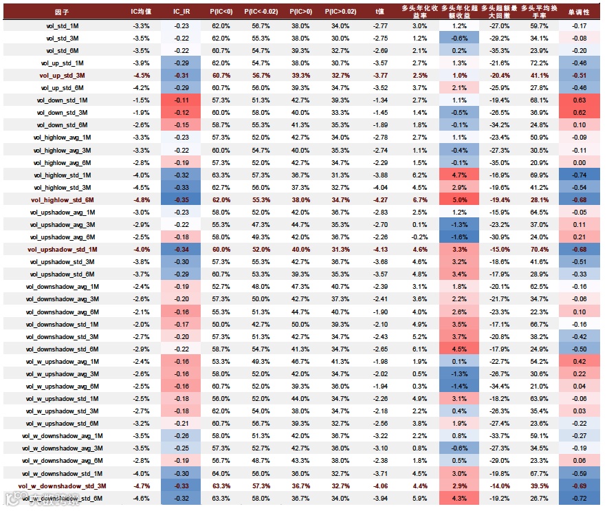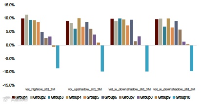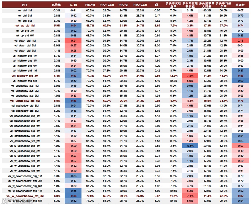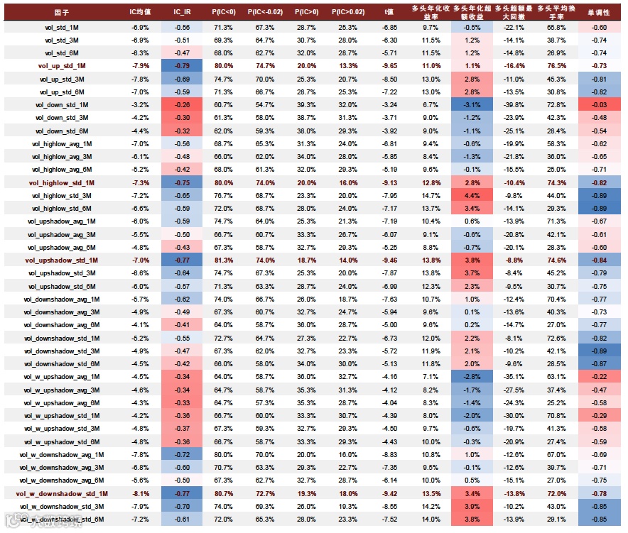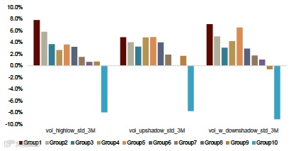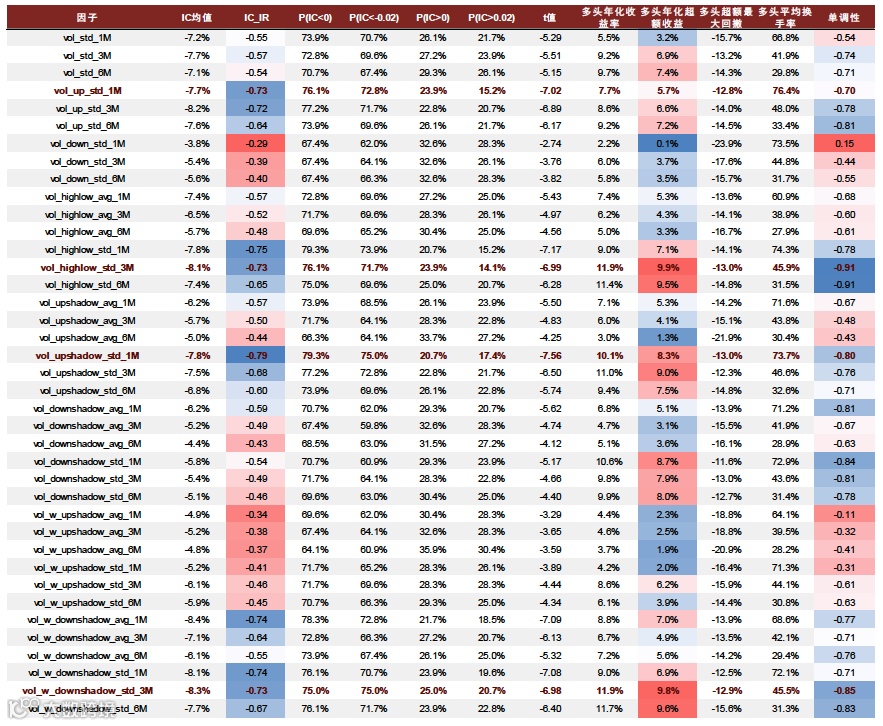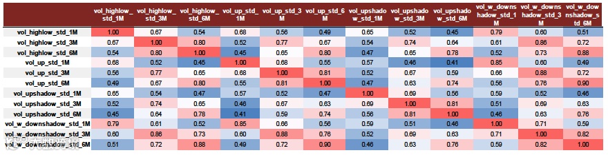 vol_highlow_std_3M、vol_upshadow_std_6M和vol_w_downshadow_std_3M因子在多数市场中表现良好,且彼此相关性较高。据此,波动率因子可分为收益波动率与振幅因子两类[k]
