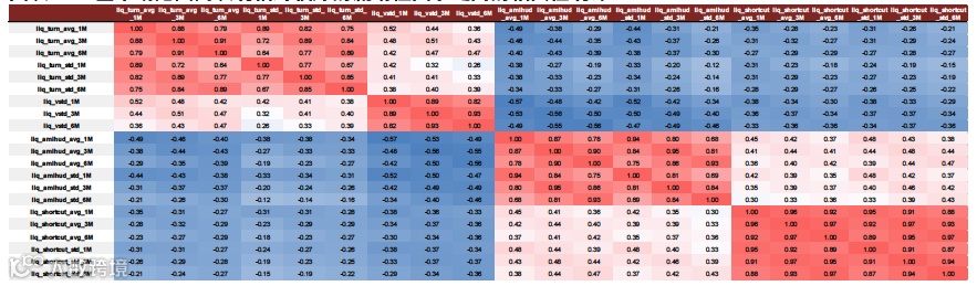 图表30:全市场范围内表现相对较好的流动性因子之间的相关性统计
