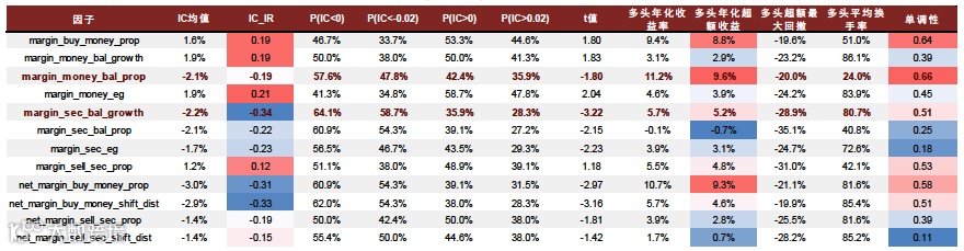 融资因子与融券因子表现分化。其中,margin_money_bal_prop因子在全市场范围内单调性相对较好,IC均值为-2.7%,IC_IR为-0.37[k]。融券因子中,margin_sec_bal_growth在中证500和中证1000中表现较优,IC均值为-1.8%,IC_IR为-0.27;net_margin_sell_sec_shift_dist在沪深300中具备一定选股能力,IC均值为-1.5%,IC_IR为-0.18[k]。